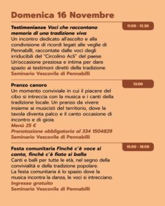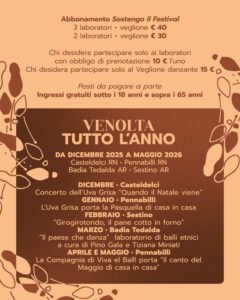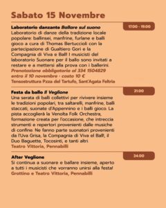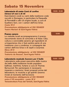 Laboratori di canto, musica e danza, pranzi canori, testimonianze, veglione e festa comunitaria: due giorni di incontri, balli e convivialità, con musicisti e cantori da tutta la Romagna e le Marche.