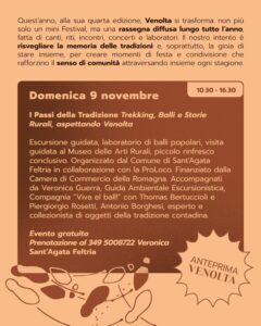Alla sua quarta edizione, Venolta si trasforma: da piccolo festival di balli e musiche popolari di confine diventa una rassegna diffusa lungo tutto l’anno, fatta di canti, riti, incontri, concerti e laboratori.